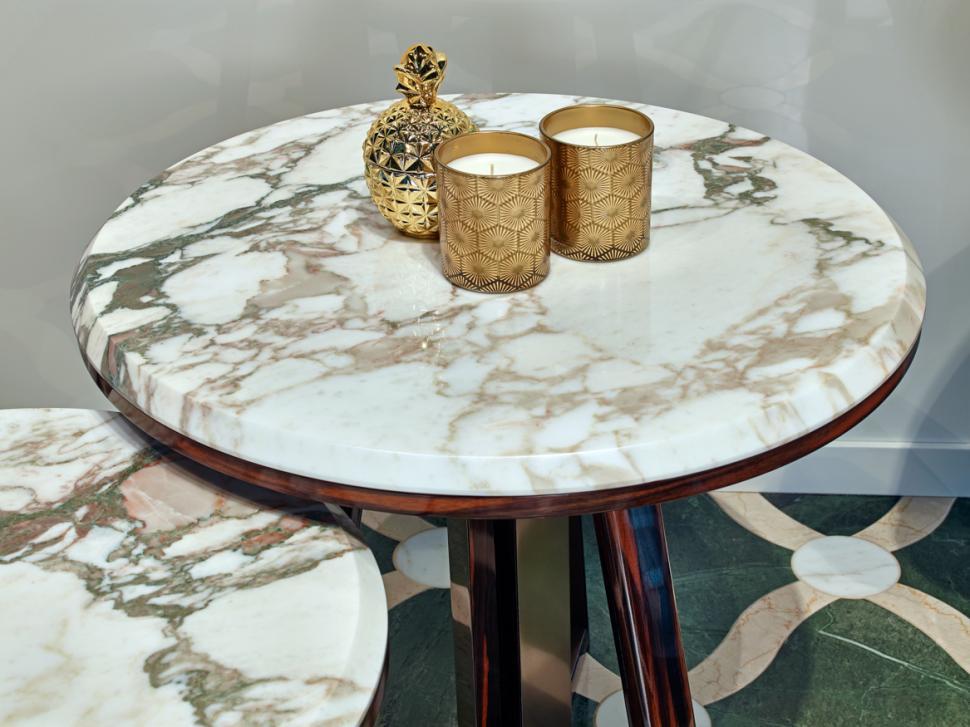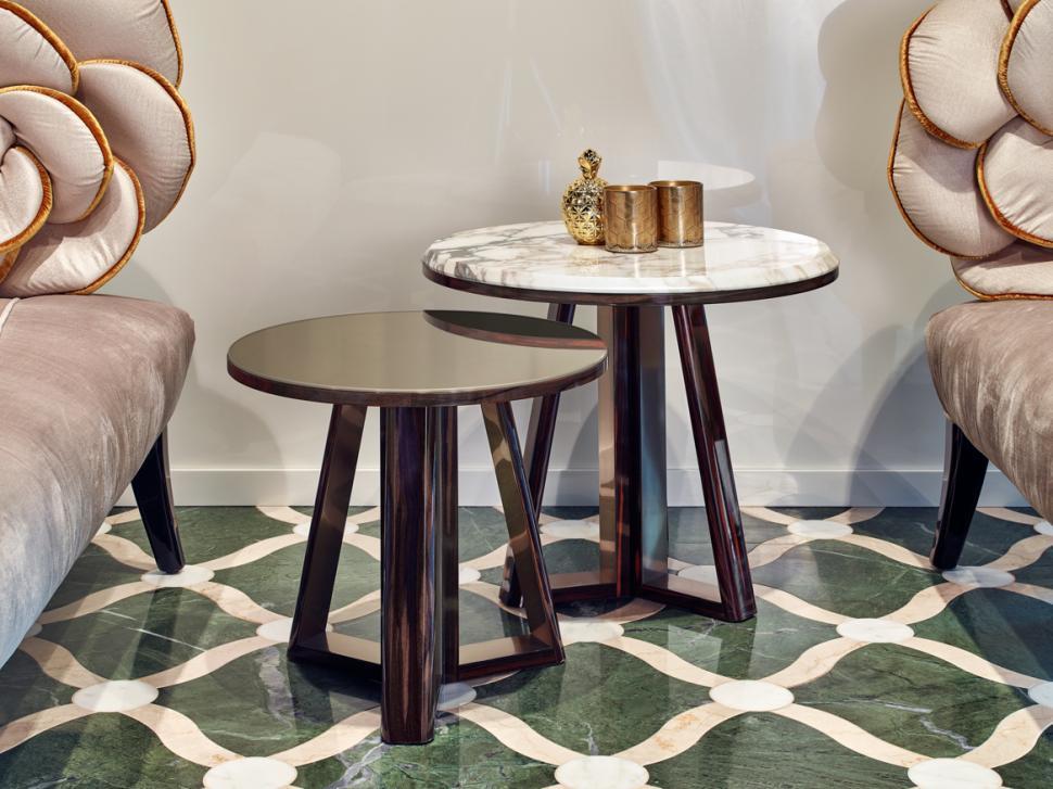 Столик RAY сочетает в себе структуру из черного дерева и отделку из бронзового жидкого металла или марлевого олова с верхом из зеркального или Калакаттского золотого мрамора. Каждый элемент создается вручную мастерами фабрики SICIS, что обеспечивает долговечность и эстетическую привлекательность.