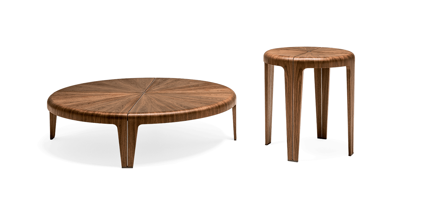 Каждый столик выполнен из высококачественных материалов, таких как грецкий орех Canaletto, известный своей прочностью и красотой. Вставки из металлического глянцевого черно-никелевого покрытия добавляют нотку современного шика, создавая уникальный контраст с теплым древесным текстурированием. Все элементы тщательно обработаны вручную, что подчеркивает индивидуальность каждого изделия и его эксклюзивность.