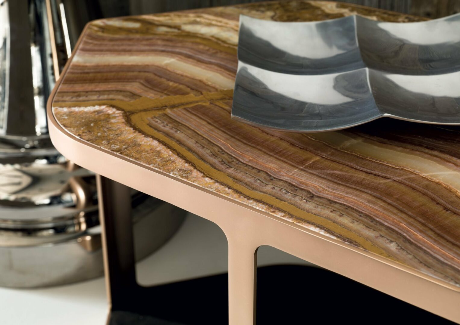 Каждый элемент столика TILES говорит о высоком качестве и долговечности. Использование таких материалов как мрамор Portoro, мрамор Sahara Noir, и многих других, делает этот столик не только красивым, но и прочным. Разнообразие отделок столешницы, включая дымчатое зеркало и красный оникс, позволяет адаптировать его к любому стилю интерьера, будь то классика или современный минимализм.