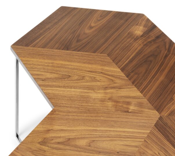 Сочетание хромированной металлической конструкции и деревянной полки придает журнальному столику TRIAD не только прочность, но и невероятную элегантность. Его размеры — H50 см, 120×120 см — делают его подходящим для различных пространств: от уютной гостиной до современных офисов. Геометрическая форма придает столу динамичность, а блестящая поверхность хрома отражает свет, создавая атмосферу утонченности и стиля.